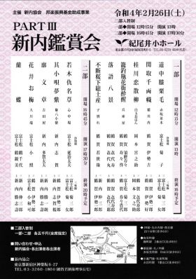 | Saturday, February 26, 2022 Part 1: 1 p.m. (doors open 12:15 p.m.; ends 4:00 p.m.) Part 2: 5:30 p.m. (doors open 4:45 p.m.; ends 8:00 p.m.) Part 1 Performers: Tsuruga Wakasanojo, Shinnai Nakasaburo, Tsuruga Isekichi, and others Place: Small Hall (5F) at Kioi Hall (across the street from the Hotel New Otani) |