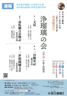 Sunday, October 15, 2023 Doors open: 1:30 p.m. Concert starts: 2 p.m. Concert ends 4:25 p.m. Performers: Tsuruga Wakasanojo XI, Shinnai Nakasaburo, others Program: 4 works including shinnai: Ichinotani Futaba Gunki: Kumiuchi no Dan Place: Small Theatre, National Theatre, Hayabusa-cho 4-1, Chiyoda-ku, Tokyo Access by subway: The National Theatre is 5 minutes’ walk from the Hanzomon Station on the Hanzomon Line, or 10 minutes’ walk from the Nagatacho Station on the Yurakucho, Hanzomon, and Nanboku lines. Tickets (tax included): Adults: 6,000 yen; students, 4,200 yen (student ID required) People with disabilities: 20% discount. Space is available for wheelchairs. All seats are reserved. Advance sale: Tickets will be sold at the door on the day of the performance. |